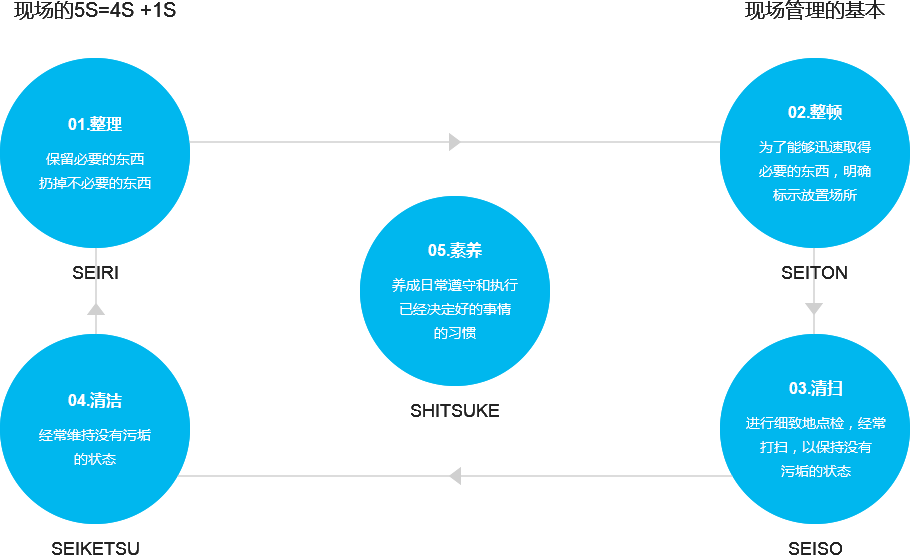 5S是指整理、整顿、清扫、清洁、素养。我们是通过推行整理、整顿、清扫来强化管理,再用清洁来巩固改善成果。此外,我们还可以通过5S来规范员工的行为,通过规范员工的行为来改变员工的工作态度,从而消除安全隐患,使之成为习惯。5S活动起源于1955年的日本企业,而大多数日企的5S都做得很好。这也是世界500强中,日本企业立足的根本。